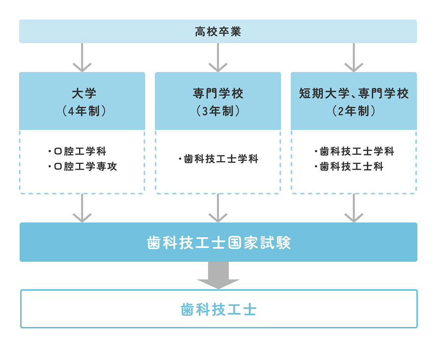 - 高校卒業後、歯科技工士養成校(大学(4年制)・専門学校(3年制・2年制)・短大(2年制))に進学できます。